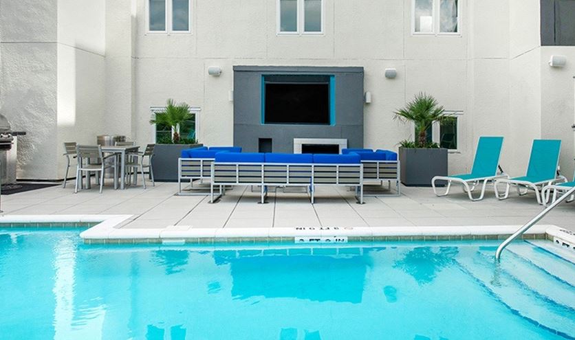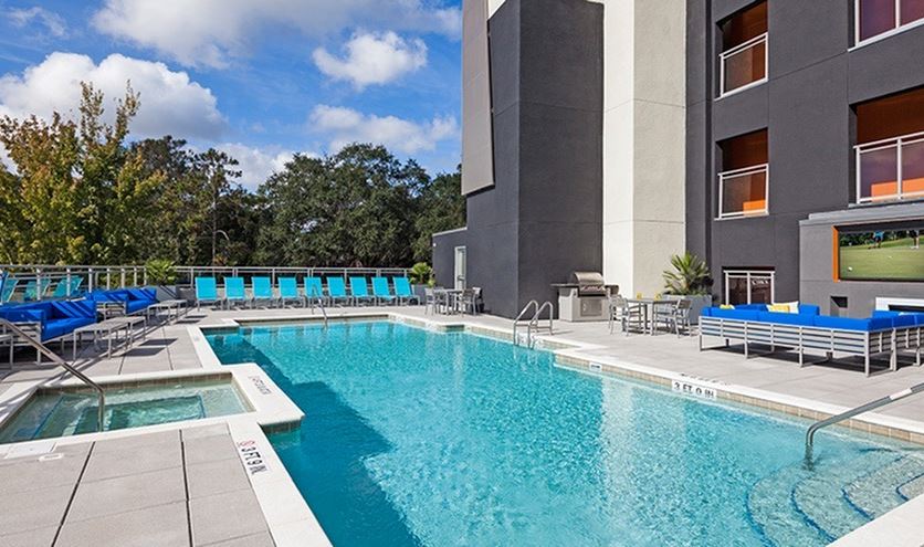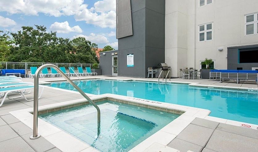 - Relax with friends at the swimming pool overlooking UF campus with a hot tub, shaded cabanas, and gas grills.